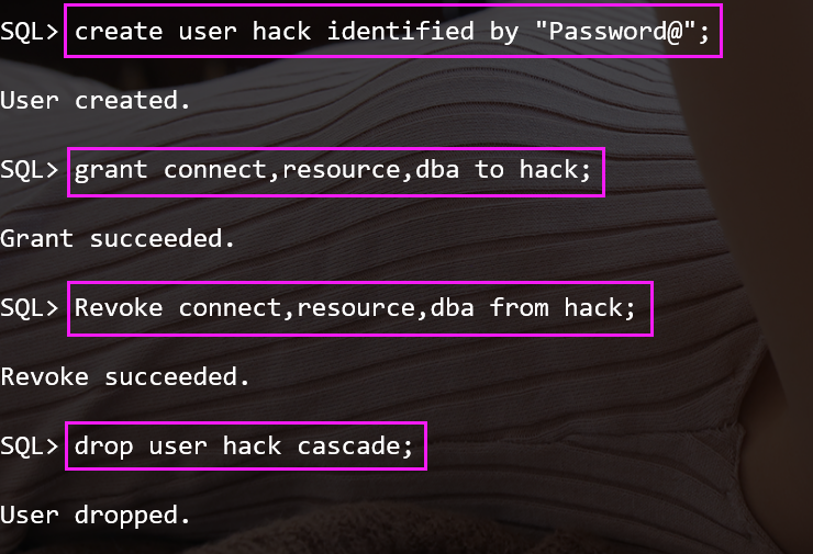 drop user hack cascade; #删除hack用户,加上cascade则将用户连同其创建的东西全部删除