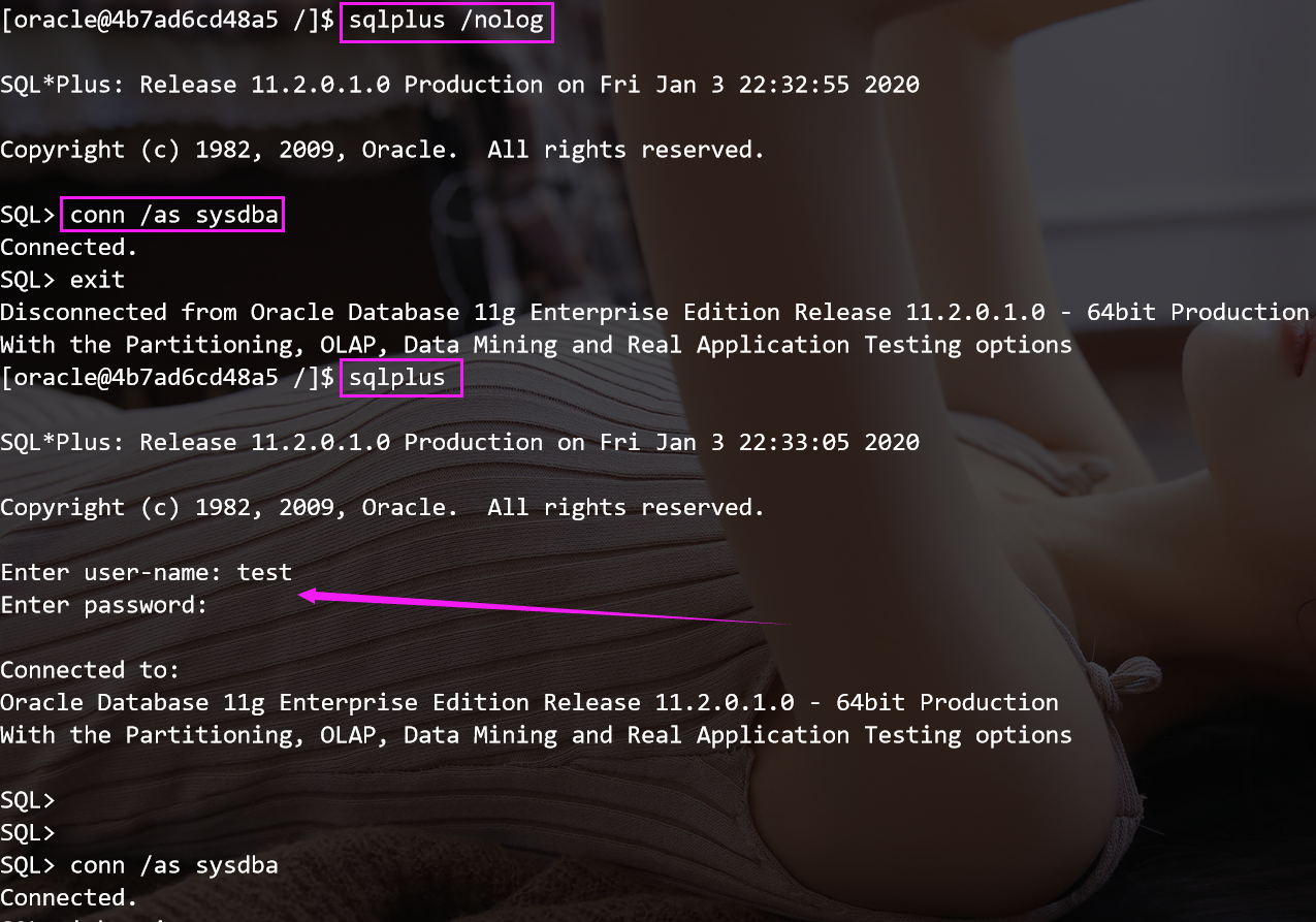 sqlplus /nolog #进入oracle数据库管理,加上 /nolog 就不用输入用户名密码