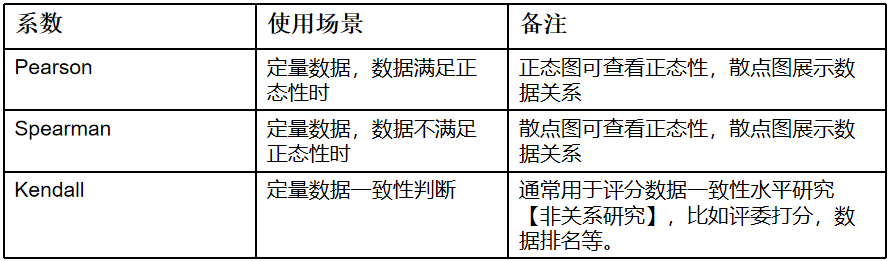 5. 相关系数常见有两类,分别是Pearson和Spearman,本系统默认使用Pearson相关系数。在相关分析之前,SPSSAU建议可使用散点图直观查看数据之间的关系情况。除此之外,SPSSAU还提供Kendall相关系数。三个相关系数的区别如下表格: