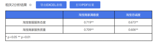 上表使用相关分析去研究“淘宝商家满意度”,“淘宝忠诚度”分别与“淘宝客服服务态度”,“淘宝商家服务质量”之间的相关关系情况,并且使用Pearson相关系数去表示相关关系情况。从上表可以看到: