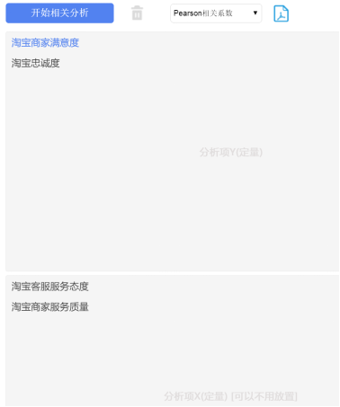 比如想研究“淘宝客服服务态度”,“淘宝商家服务质量”分别与“淘宝商家满意度”,“淘宝忠诚度”之间的关系情况,此句话中明显的可以看出“淘宝客服服务态度”,“淘宝商家服务质量”这两项为 X;而“淘宝商家满意度”,“淘宝忠诚度”这两项为 Y。