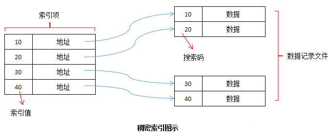 在稠密索引中,文件中的每个搜索码值都对应一个索引值。也就是说,稠密索引为数据记录文件的每一条记录都设一个键-指针对。如下图所示,索引项包括索引值以及指向该搜索码的第一条数据记录的指针,即我们所说的键-指针对。