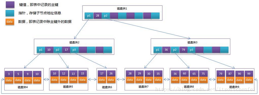 每个节点占用一个磁盘块,一个节点上有两个升序排序的关键字和三个指向子树根节点的指针,指针存储的是子节点所在磁盘块的地址。两个关键词划分成的三个范围域对应三个指针指向的子树的数据的范围域。以根节点为例,关键字为 17 和 35,P1 指针指向的子树的数据范围为小于 17,P2 指针指向的子树的数据范围为 17~35,P3 指针指向的子树的数据范围为大于 35。