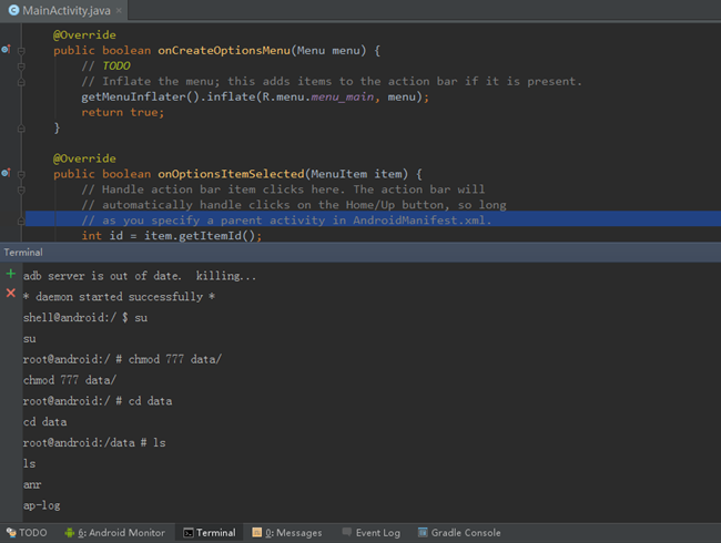 4.对比Eclipse,Android Studio非常有特点的地方要数自带的“Terminal”了,对于Android开发人员来说这比单独开一个cmd方便多了,使用起来特别自如;