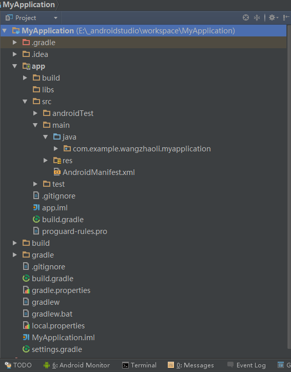可以看到和Eclipse的目录结构有很大区别,Android Studio一个窗口只能有一个项目,而Eclipse则可以同时存在很多项目,如果你看着不习惯可以点击左上角的Android机器人进行切换: