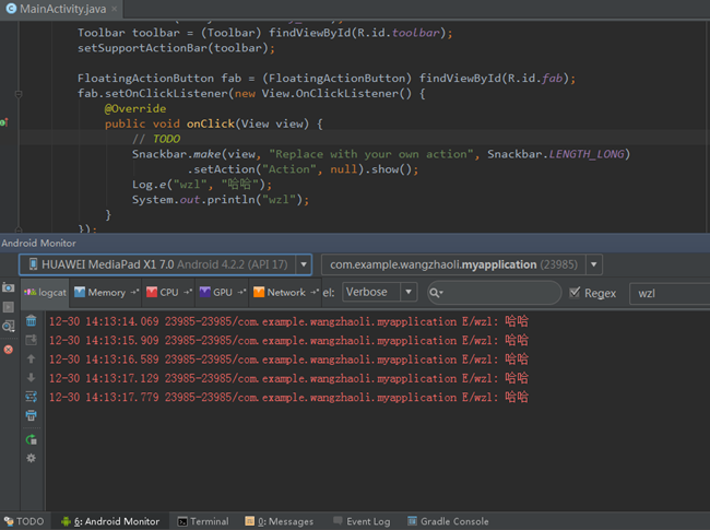3.Android Monitor视图中有Logcat、Memory等界面,关于Logcat使用起来也很方便;