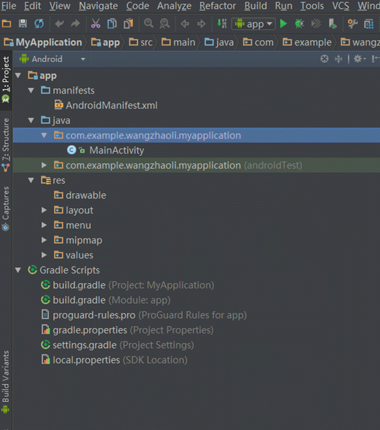 2、上述目录中将java代码和资源文件(图片、布局文件等)全部归结为src,在src目录下有一个main的分组,同时划分出java和res两个文件夹,java文件夹则相当于Eclipse下的src文件夹,res目录结构则一样.