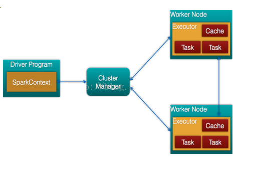 - 通常当需要处理的数据量超过了单机尺度(比如我们的计算机有4GB的内存,而我们需要处理100GB以上的数据)这时我们可以选择spark集群进行计算,有时我们可能需要处理的数据量并不大,但是计算很复杂,需要大量的时间,这时我们也可以选择利用spark集群强大的计算资源,并行化地计算,其架构示意图如下: