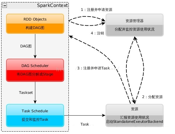 - SparkContext将Applicaiton代码发送给StandaloneExecutorBackend;并且SparkContext解析Applicaiton代码,构建DAG图,并提交给DAG Scheduler分解成Stage(当碰到Action操作时,就会催生Job;每个Job中含有1个或多个Stage,Stage一般在获取外部数据和shuffle之前产生),然后以Stage(或者称为TaskSet)提交给Task Scheduler,Task Scheduler负责将Task分配到相应的Worker,最后提交给StandaloneExecutorBackend执行;