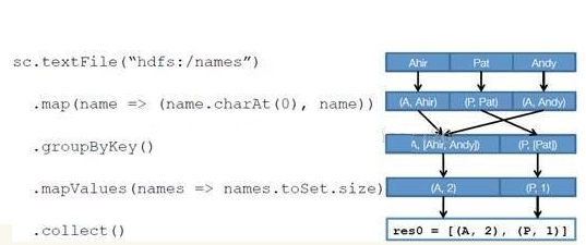 - 以下面一个按 A-Z 首字母分类,查找相同首字母下不同姓名总个数的例子来看一下 RDD 是如何运行起来的