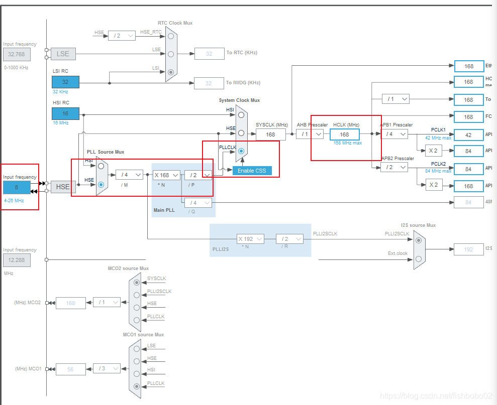7、时钟配置。因为开发板DP83848采用的是自带外部时钟,所以不需要配置MCO1。先修改外部时钟为8M,再修改HCLK为168M,按照系统提示自动配置完成。