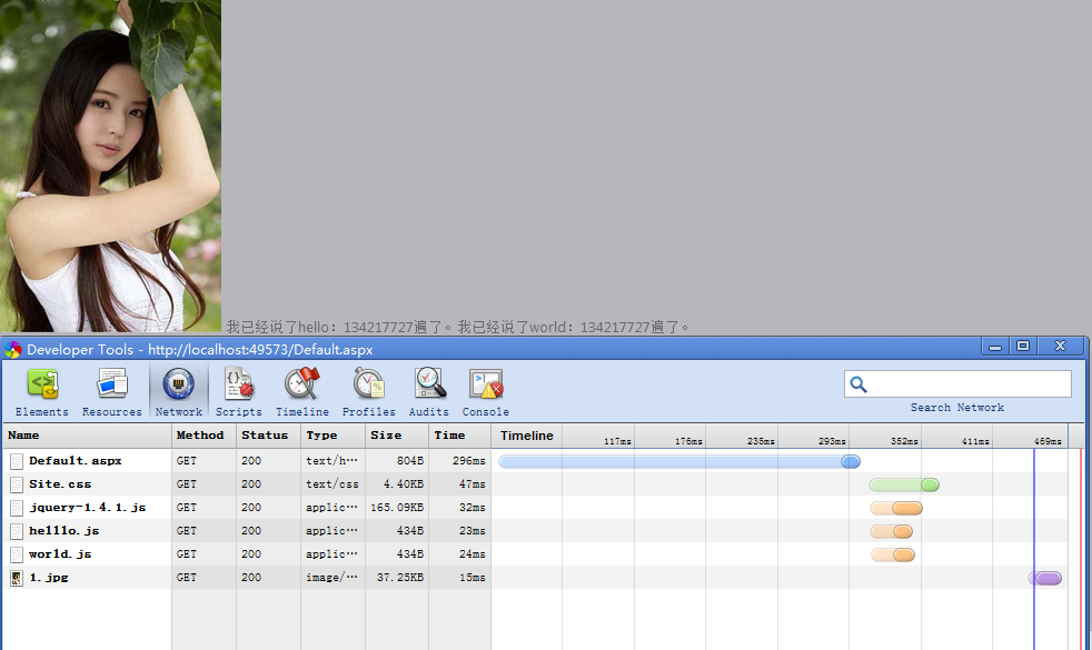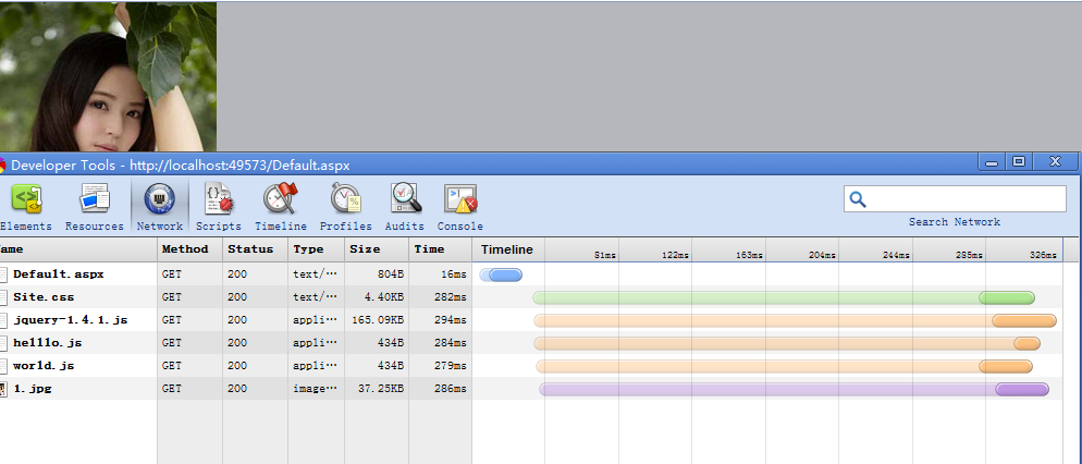 下面的图也展示了1.jpg和三个js几乎并行下载和执行。时间由上面的“469ms+”缩小到“326ms”。