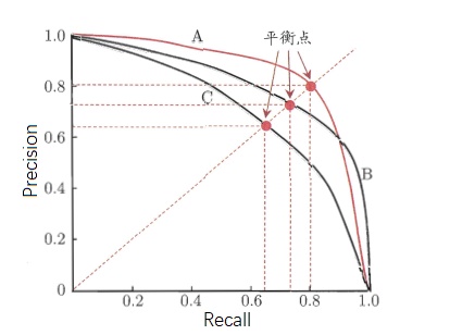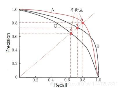 在上一小节中的P-R图中,它能直观地显示出学习器在样本总体上的精确率(查准率)和召回率(查全率),显然它是一条总体趋势是递减的曲线。在进行比较时,若一个学习器的PR曲线被另一个学习器的曲线完全包住,则可断言后者的性能优于前者,比如上图中A优于C。但是B和A谁更好呢?因为AB两条曲线交叉了,所以很难比较,这时比较合理的判据就是比较PR曲线下的面积,该指标在一定程度上表征了学习器在查准率和查全率上取得相对“双高”的比例。因为这个值不容易估算,所以人们引入“平衡点”(BEP)来度量,他表示“精确率=召回率”时的取值,值越大表明分类器性能越好,以此比较我们一下子就能判断A较B好。