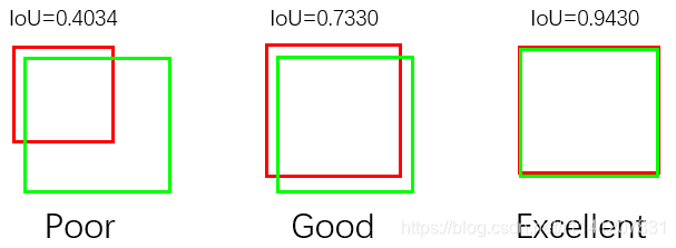 上图展示了IoU的好坏对比,与ground-truth bounding boxes 重叠比例更大的预测边界框比重叠较少的边界框具有更高的分数,这使得IoU成为评估目标检测器的极佳指标。我们并不关心(x,y)坐标的精确匹配,但我们确实希望确保我们预测的边界框尽可能匹配——IoU可以做到这一点。