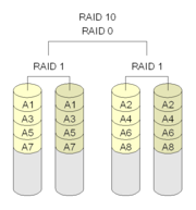 一些文献把这两种 RAID 等级看作是等同的,本文认为是不同的。 RAID01 是先做条带化再作镜像,本质是对物理磁盘实现镜像;而 RAID10 是先做镜像再作条带化,是对虚拟磁盘实现镜像。相同的配置下,通常 RAID01 比 RAID10 具有更好的容错能力。