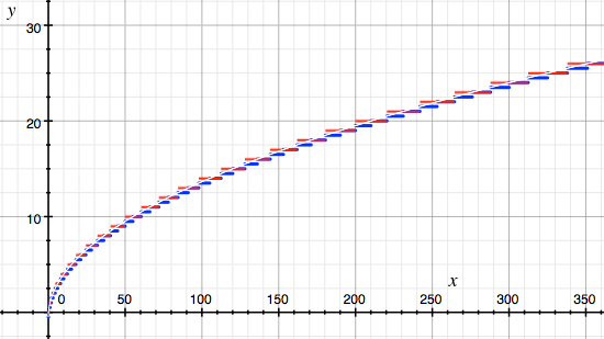 floor((1 + sqrt(1 + 8*c))/2) (blue) vs int(sqrt(2 * c)) (red) vs Exact (white line)