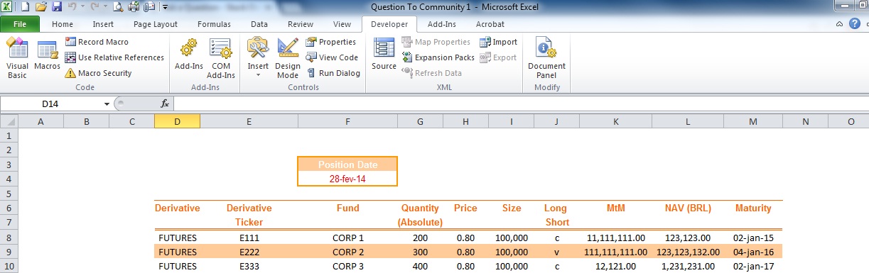I would be interested in a macro that will instead of copy the data from a manually fixed range e.g. D8, in this case {Range("D8").Select, Selection.copy …} to copy the data in the column by the title of the column e.g. Derivative Class, Derivative Ticker, Fund, Price .. Etc.