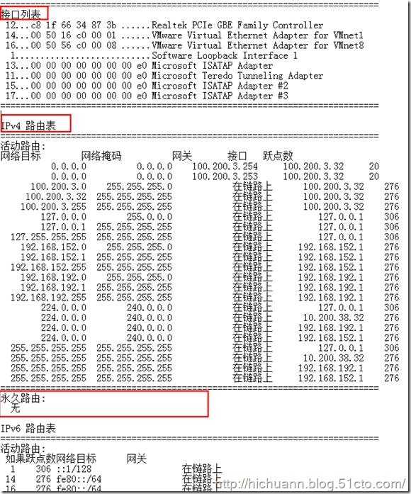 - 显示IP路由表的完整内容,如下图所示:首先显示了当前主机的所有接口列表,接下来显示IPv4路由表和IPv4永久路由,可以看到,我的IPv4路由表有两个默认网关,且无手动添加的IPv4永久路由。