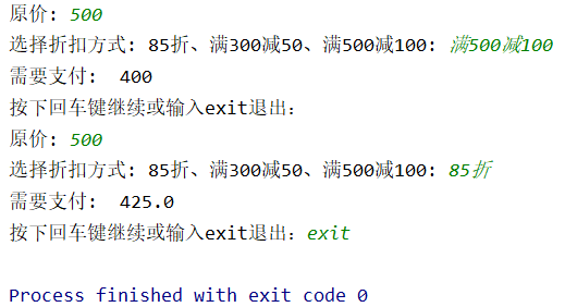 if __name__ == '__main__': command = '' while command != 'exit': cashes = eval(input("原价: ")) types = {'85折': Accept(Charge()), '满300减50': Accept(Reduction1()), '满500减100': Accept(Reduction2()),} model = input("选择折扣方式: 85折、满300减50、满500减100: ") if model in types: money = types[model] print("需要支付: ", money.get_result(cashes)) else: print("不存在的折扣方式") command = input("按下回车键继续或输入exit退出:")