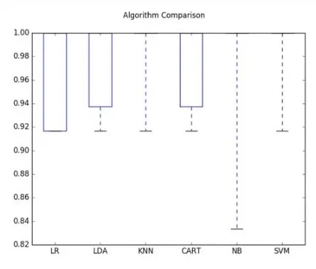 LR: 0.966667 (0.040825) LDA: 0.975000 (0.038188) KNN: 0.983333 (0.033333) CART: 0.975000 (0.038188) NB: 0.975000 (0.053359) SVM: 0.981667 (0.025000)