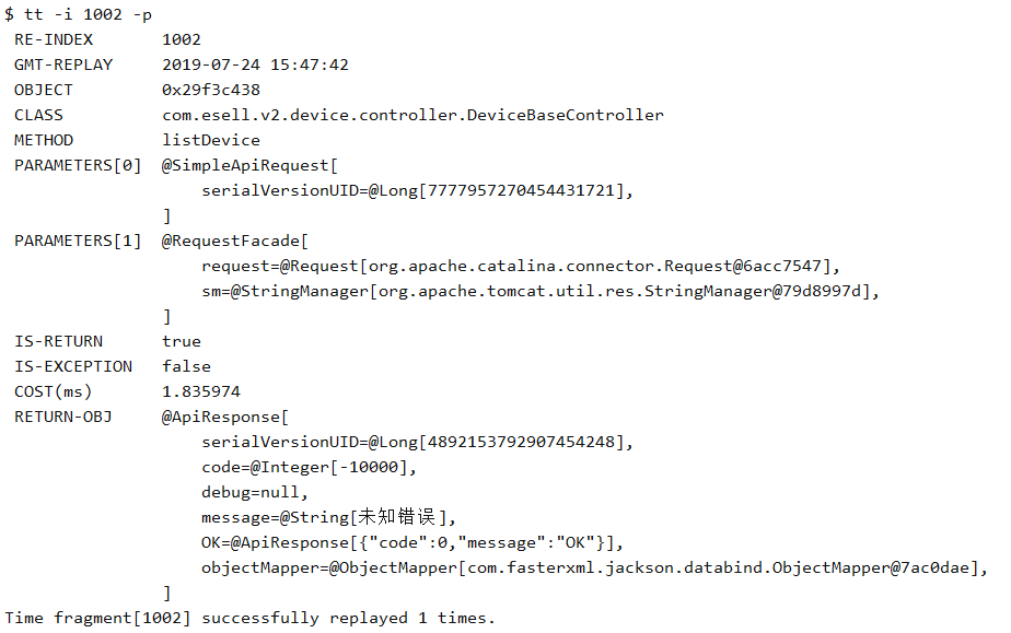 tt 命令由于保存了当时调用的所有现场信息,所以我们可以自己主动对一个 INDEX 编号的时间片自主发起一次调用,从而解放你的沟通成本。此时你需要 -p 参数。通过 --replay-times 指定 调用次数,通过 --replay-interval 指定多次调用间隔(单位ms, 默认1000ms)