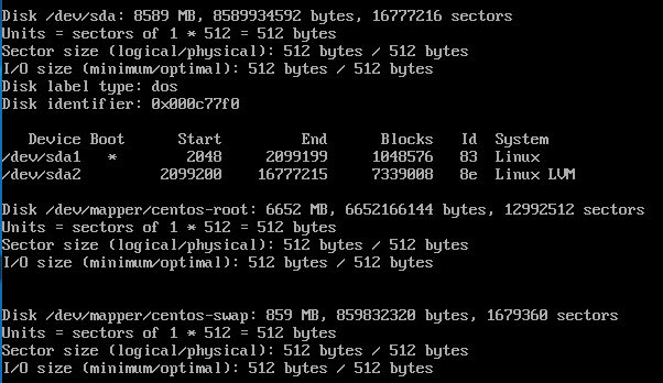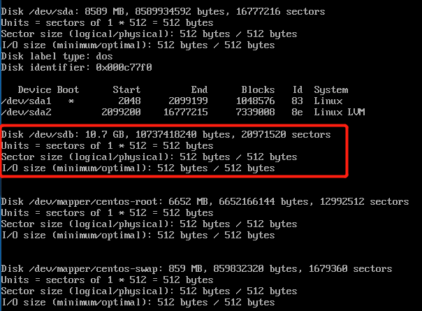 为了创建新的物理卷,我们先增加一块新的磁盘,并且挂载到文件系统。先用fdisk命令看看目前系统的所有磁盘: