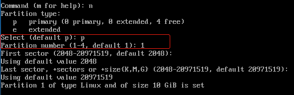 /dev/sdb1 2048 20971519 10484736 83 Linux