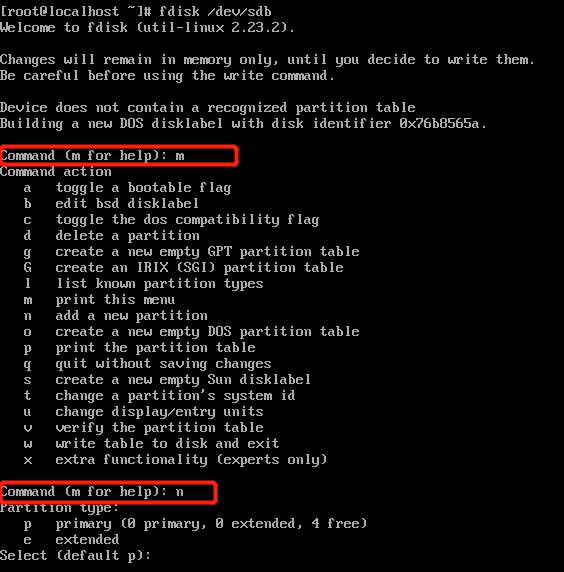 操作的方式参考2.1.2,依次选择m、n、p随后的选项都选择默认回车即可。 最后挂载到指定目录: