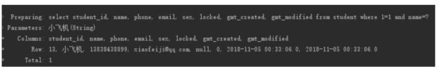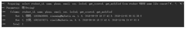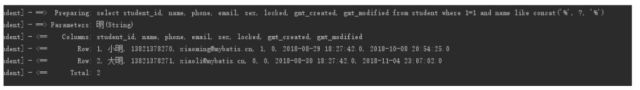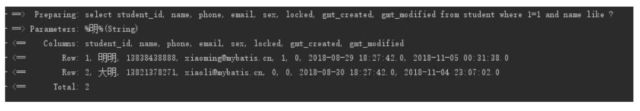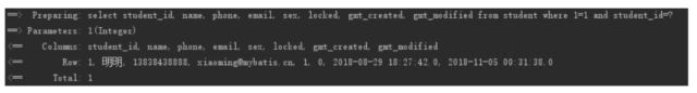 <pre data-offset-key="u5cv-0-0"> <pre data-block="true" data-editor="fj6sl" data-offset-key="u5cv-0-0"> @Test public void selectByStudentWhereTag() { SqlSession sqlSession = null; sqlSession = sqlSessionFactory.openSession(); StudentMapper studentMapper = sqlSession.getMapper(StudentMapper.class); Student search = new Student(); search.setName("明"); System.out.println("只有名字时的查询"); List<Student> studentsByName = studentMapper.selectByStudentSelectiveWhereTag(search); for (int i = 0; i < studentsByName.size(); i++) { System.out.println(ToStringBuilder.reflectionToString(studentsByName.get(i), ToStringStyle.MULTI_LINE_STYLE)); } search.setSex((byte) 1); System.out.println("姓名和性别同时存在的查询"); List<Student> studentsBySex = studentMapper.selectByStudentSelectiveWhereTag(search); for (int i = 0; i < studentsBySex.size(); i++) { System.out.println(ToStringBuilder.reflectionToString(studentsBySex.get(i), ToStringStyle.MULTI_LINE_STYLE)); } System.out.println("姓名和性别都不存在时查询"); search.setName(null); search.setSex(null); List<Student> studentsByNameAndSex = studentMapper.selectByStudentSelectiveWhereTag(search); for (int i = 0; i < studentsByNameAndSex.size(); i++) { System.out.println(ToStringBuilder.reflectionToString(studentsByNameAndSex.get(i), ToStringStyle.MULTI_LINE_STYLE)); } sqlSession.commit(); sqlSession.close(); } </pre>