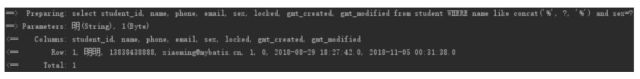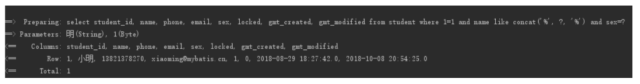 <pre data-offset-key="7caff-0-0"> <pre data-block="true" data-editor="fj6sl" data-offset-key="7caff-0-0"> where 1=1 and name like concat('%', ?, '%') and sex=? </pre>