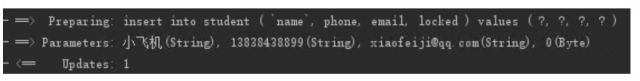 <pre data-offset-key="alu1j-0-0"> <pre data-block="true" data-editor="fj6sl" data-offset-key="alu1j-0-0"> [@Test](https://my.oschina.net/azibug) public void insertByStudentSelective() { SqlSession sqlSession = null; sqlSession = sqlSessionFactory.openSession(); StudentMapper studentMapper = sqlSession.getMapper(StudentMapper.class); Student student = new Student(); student.setName("小飞机"); student.setPhone("13838438899"); student.setEmail("xiaofeiji@qq.com"); student.setLocked((byte) 0); System.out.println(studentMapper.insertSelective(student)); sqlSession.commit(); sqlSession.close(); } </pre>