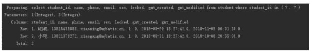 <pre data-offset-key="23tgn-0-0"> <pre data-block="true" data-editor="fj6sl" data-offset-key="23tgn-0-0"> @Test public void selectByStudentIdList() { SqlSession sqlSession = null; sqlSession = sqlSessionFactory.openSession(); StudentMapper studentMapper = sqlSession.getMapper(StudentMapper.class); List<Integer> ids = new LinkedList<>(); ids.add(1); ids.add(3); List<Student> students = studentMapper.selectByStudentIdList(ids); for (int i = 0; i < students.size(); i++) { System.out.println(ToStringBuilder.reflectionToString(students.get(i), ToStringStyle.MULTI_LINE_STYLE)); } sqlSession.commit(); sqlSession.close(); } </pre>