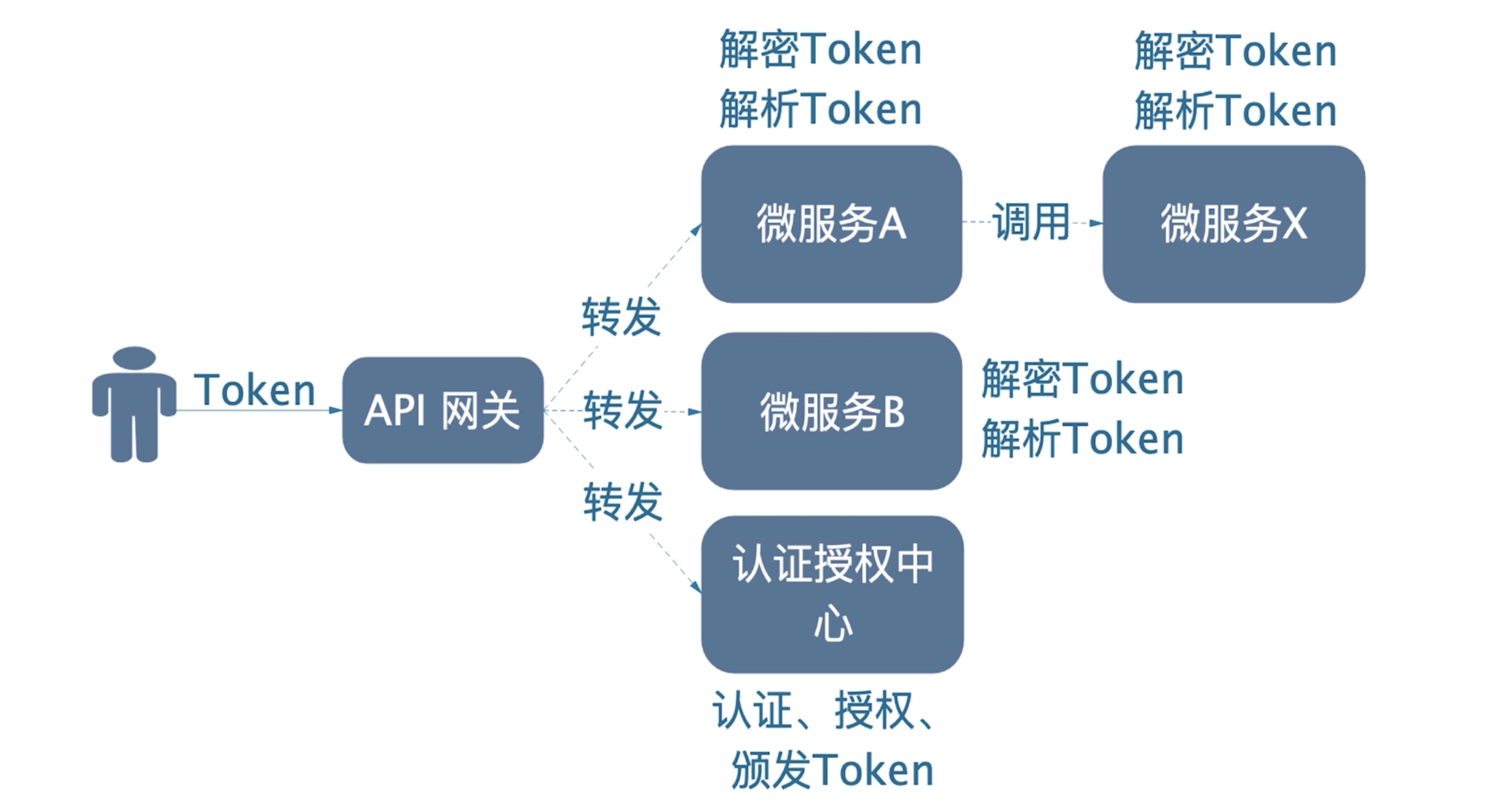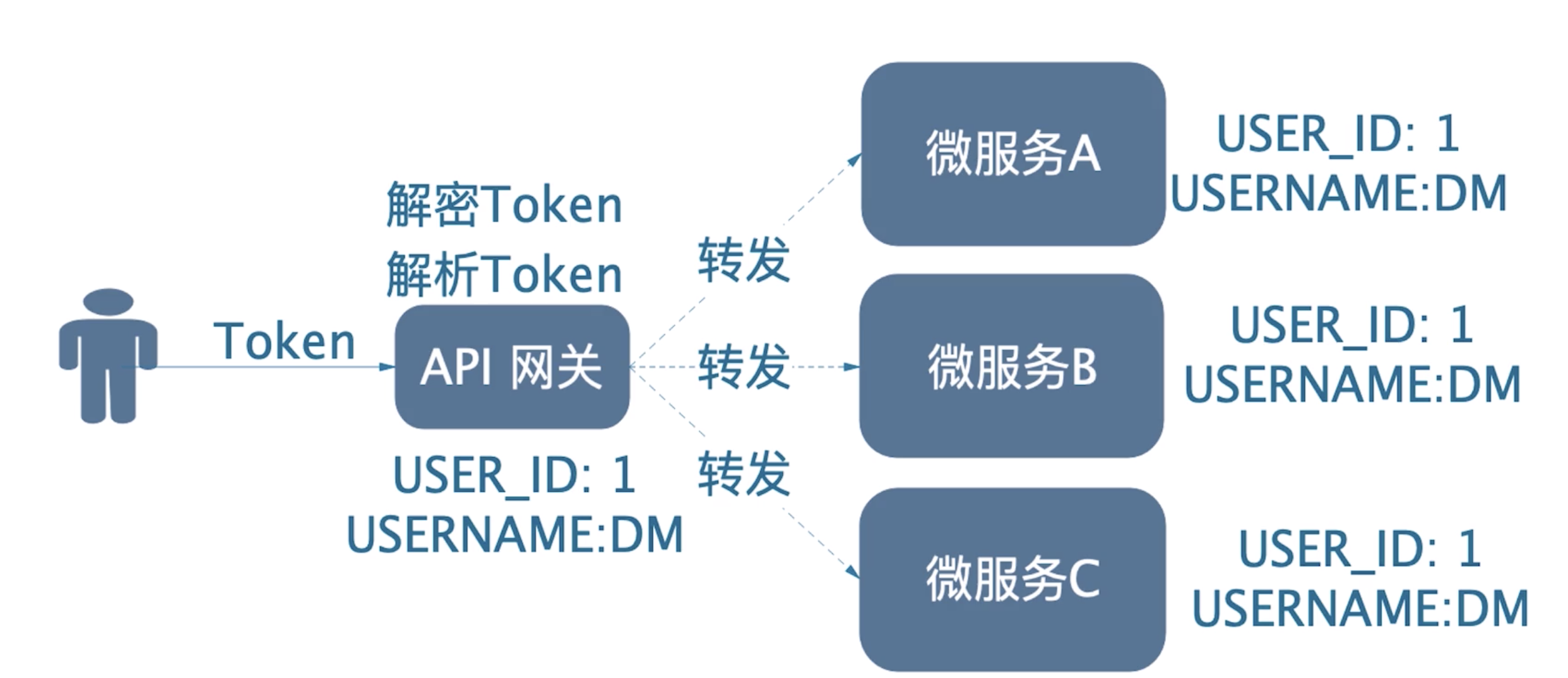该形式的token认证解析都是由网关来处理的,解析后也可以携带User_ID,UserName带给后端的微服务,一切都是网关来决定用户是谁,后端微服务无条件接受,这种形式对网关的安全要求比较高。