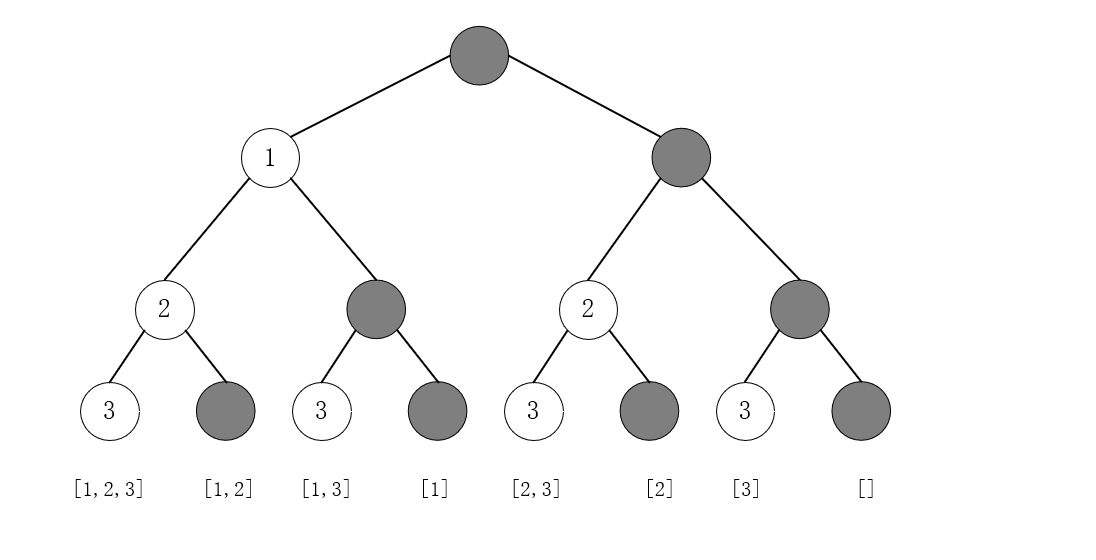 基本思想:在每个子集中,nums中的每个元素都有“出现”和“不出现”两种可能,因此每个子集都可以表示为一棵二叉树中根节点到叶节点的路径。
