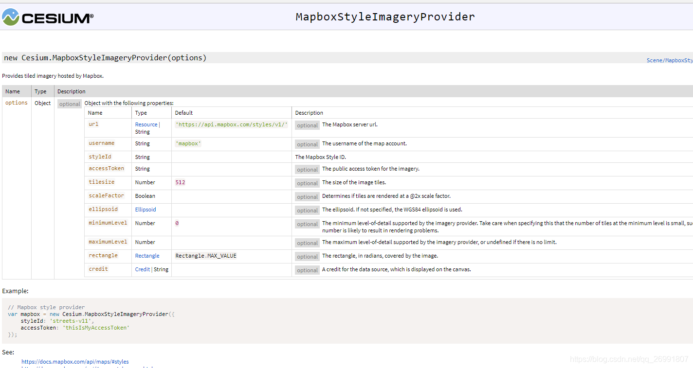 前段时间一直想把mapbox的底图添加到cesium中,一直没找到方法。刚刚在cesium的api 中找到了相关的接口,发现现在各种应用开发越来越简便了;里面相关参数写的很详细,如下: