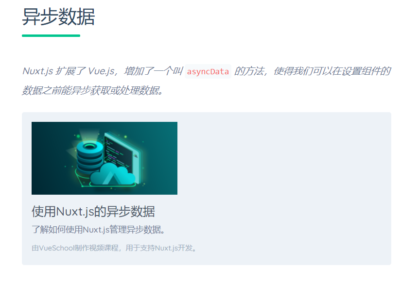 Nuxt.js 扩展了 Vue.js,增加了一个叫 asyncData 的方法,使得我们可以在设置组件的数据之前能异步获取或处理数据。