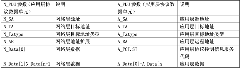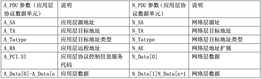 网络层协议数据单元的参数按照下表所示映射到应用层协议数据单元。用于定义接收到 的诊断请求/应答的确认/指示。