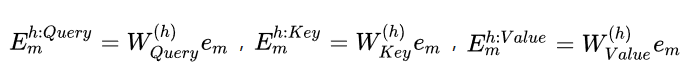 投射到多个子空间中,分别是Query,Key和Value三个空间,计算公式分别如下: