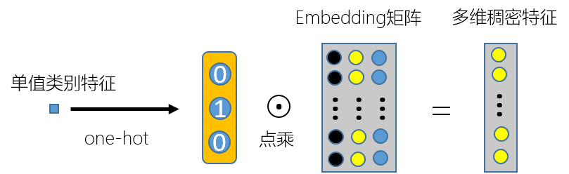 我们都知道一般单值类别特征加入到CTR预估模型的方法是先对单值类别特征进行one-hot,然后和embedding 矩阵相乘转换成多维稠密特征,如下图 1 所示: