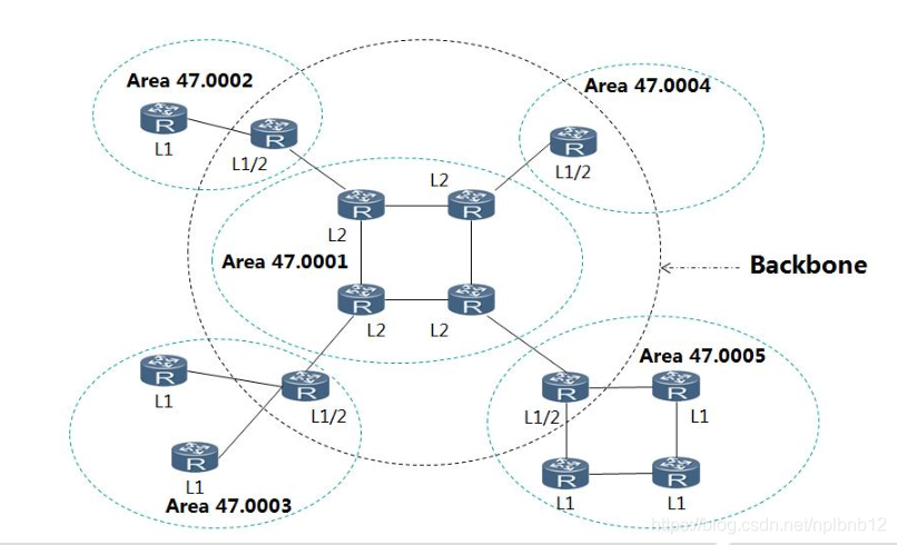 为了支持大规模的网络,IS-IS采用骨干区域与非骨干区域两级的分层结构。一般来说,将Level-1路由器部署在非骨干区域,Leverl-2路由器和Level-1-2路由器部署在骨干区域。每个非骨干区域通过Level-1-2路由器与骨干区域相连。
