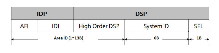 - DSP相当于IP地址中的子网号和主机地址。由High Order DSP+System ID+SEL三部分构成。High Order DSP用来分割区域,System ID用来区分主机,SEL用来指示服务类型。