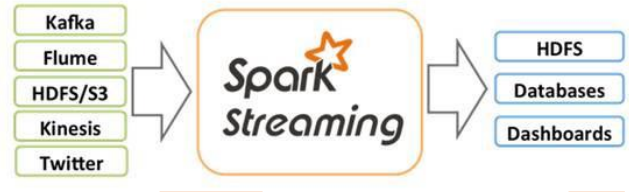 • Spark Streaming接收Kafka、Flume、HDFS等各种来源的实时输入数据,进行处理后,处理结构保存在HDFS、DataBase等各种地方