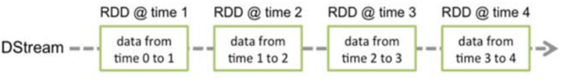 • Dstream:Spark Streaming提供了表示连续数据流的、高度抽象的被称为离散流的DStream