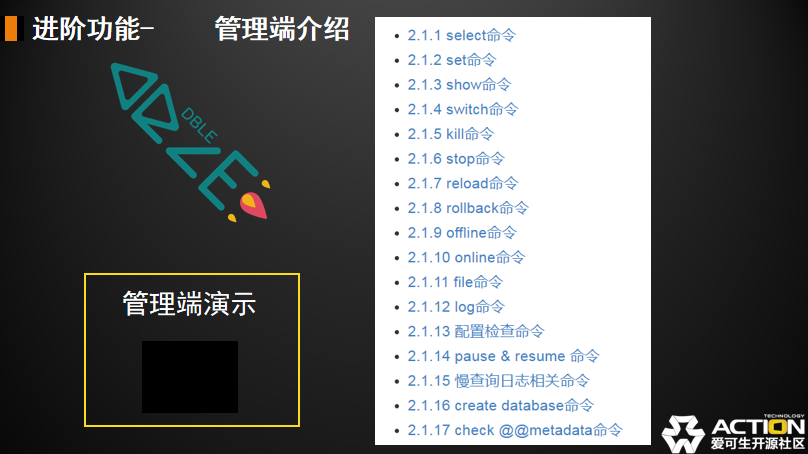 登录看下 show databases 的结果。我们通过修改 schema.xml 这种方式去看 reload 命令是怎么样热生效的。reload 命令实际上是热变更的一个操作。比如说现在把一个 testdb2 这样一个 schema 直接删掉。删掉以后有用户还在使用它,需要把用户里面的 testdb2 删掉避免依赖。现在是在修改本地的配置,其实 DBLE 用户的运行内存中是不知道这件事的。就类似我们修改 my.cnf,内存当中不知道一样。我们换一个管理端口来做一下。我们先执行 dryrun,dryrun 的功能是展示修改的问题。现在我们看到一个 WARNING 和一个 NOTICE。WARNING 其实就是说我的修改在 db5 上没用了,建议及时把 db5 删掉,但不删掉也没关系。然后去执行这样一个语句 reload @@config_all 。执行完成,原来 show databases 看到的两个数据库现在变成了一个。通过这样一种方式,我们可以热变更配置内容去加载到内存当中。这是我们管理端应用的一个简单的介绍。管理端命令目前有这么多,特别是 select / show 命令,大概有几十个吧。可能用到监控的时候才需要一一的整理学习。管理来说 reload 系列是最重要。好,我们今天先介绍到这里。