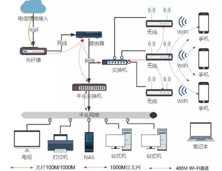 家庭网络从出口宽带到终端是一条整体链路,分为以下几个部分。