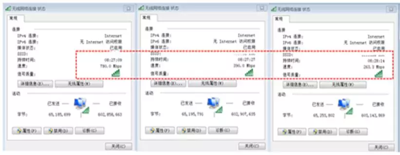 简析:从客户端角度出发,诊断网络质量好坏的直接体现在协商速率上:因为协商速率是根据信号值、噪声、干扰、重传率等一系列射频参数综合体现出来的。故障如下图所示(网络速率不稳定1分钟内大幅度跳动)。