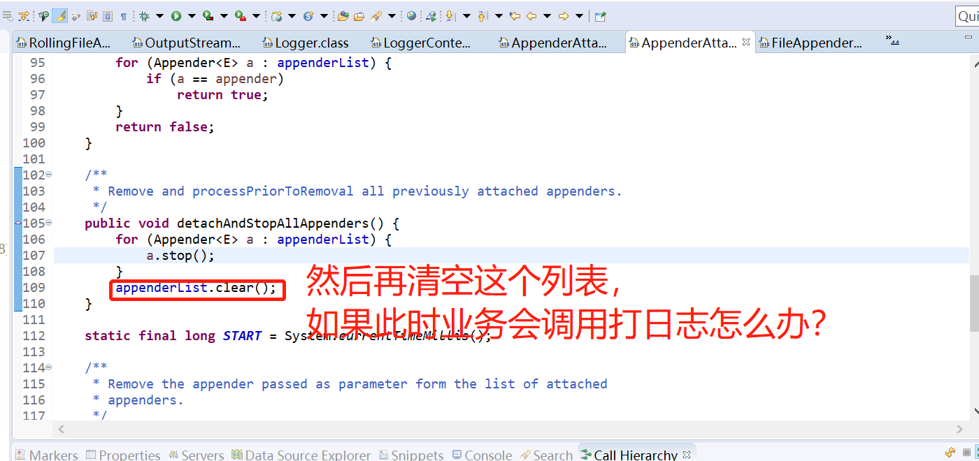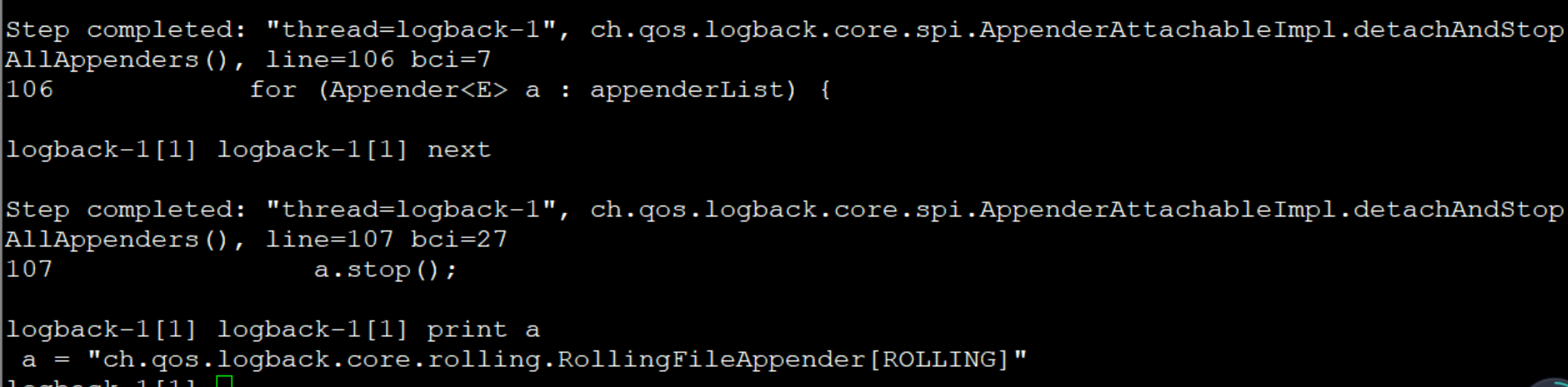 断点在 stop at ch.qos.logback.core.spi.AppenderAttachableImpl:50 --- 这是为了获取主线程 stop at ch.qos.logback.core.spi.AppenderAttachableImpl:51 stop at ch.qos.logback.core.joran.spi.ConfigurationWatchList:83 stop at ch.qos.logback.core.spi.AppenderAttachableImpl:109 执行run 到达断点 stop at ch.qos.logback.core.spi.AppenderAttachableImpl:50 找到主线程号,suspend 主线程号,然后执行cont 到达断点 ch.qos.logback.core.joran.spi.ConfigurationWatchList:83 然后修改配置文件,保存, 执行cont 到达断点ch.qos.logback.core.spi.AppenderAttachableImpl:109 执行next,清空appenderList列表,suspend 当前线程号 resume main线程号,再执行cont 到达断点ch.qos.logback.core.spi.AppenderAttachableImpl:51 继续执行,就可以发生下面的事情!