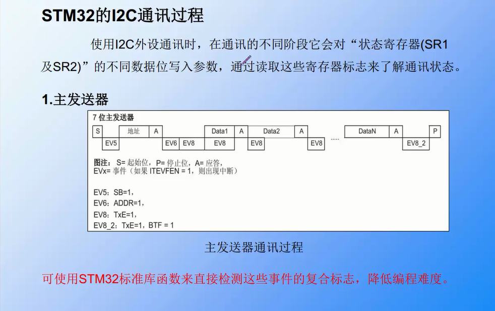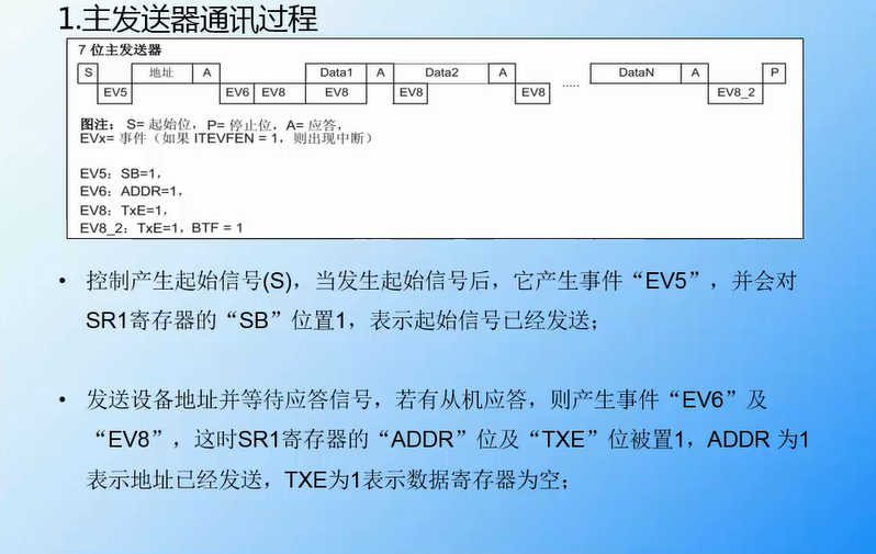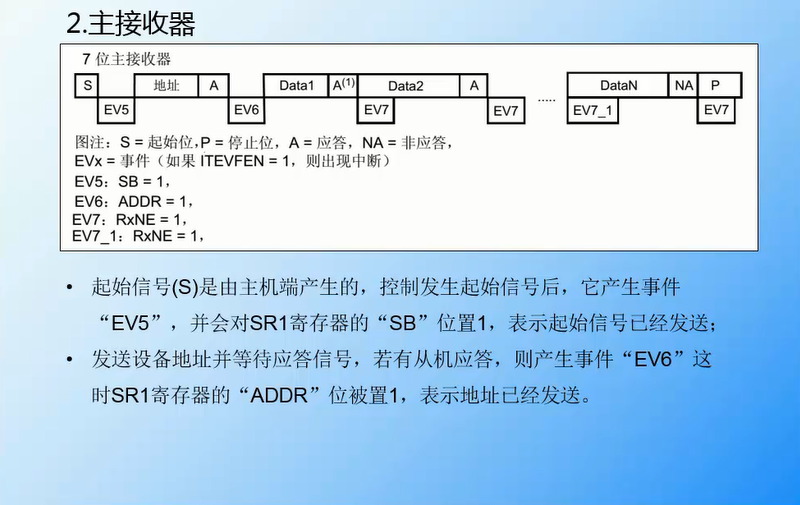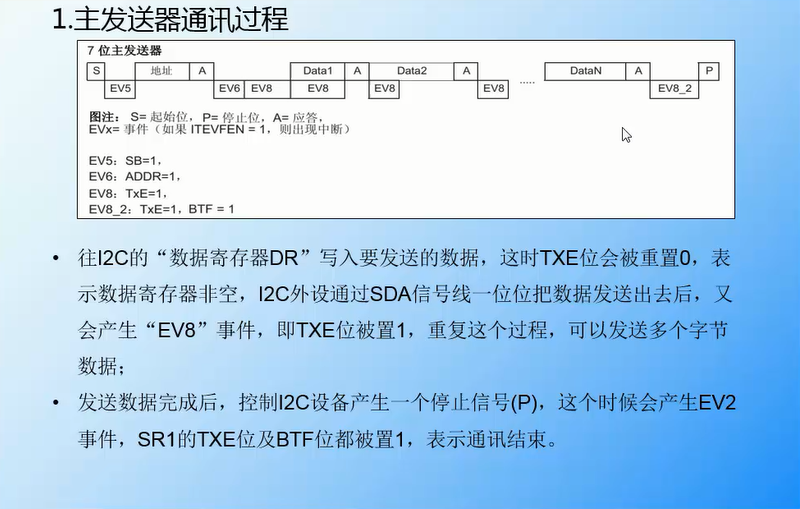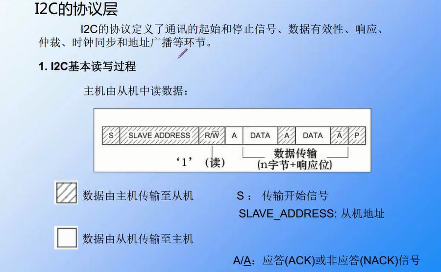 由从机读数据与写数据到从机略有不同,首先读写位不同,因为是读数据所以读写位为1,然后从机向主机发送数据,主机来回复应答信号,当主机不在接收数据时,主机会回复一个非应答信号,并发送一个停止信号,注意这里的停止信号也是主机发送的。
