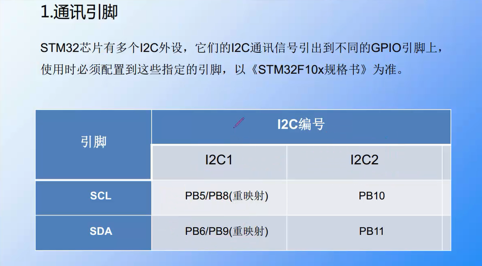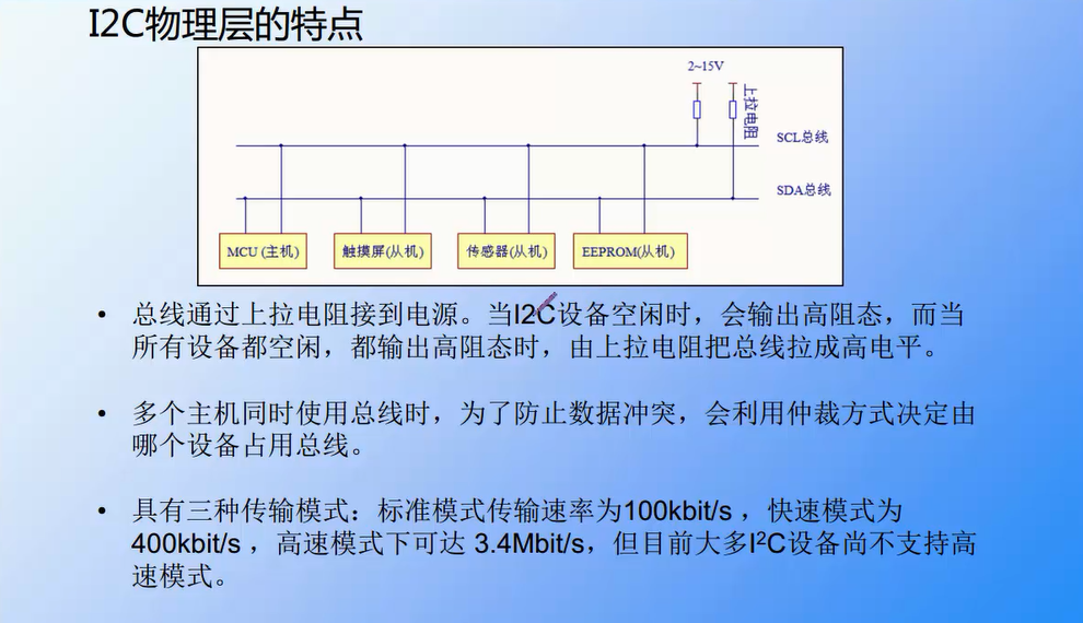 它是一个多设备总线,即总线可以挂载多个I2C通信设备,支持多个通讯主机及多个通信从机。I2C总线只使用两条总线线路,一条双向串行数据线(SDA),一条串行时钟线(SCL)。