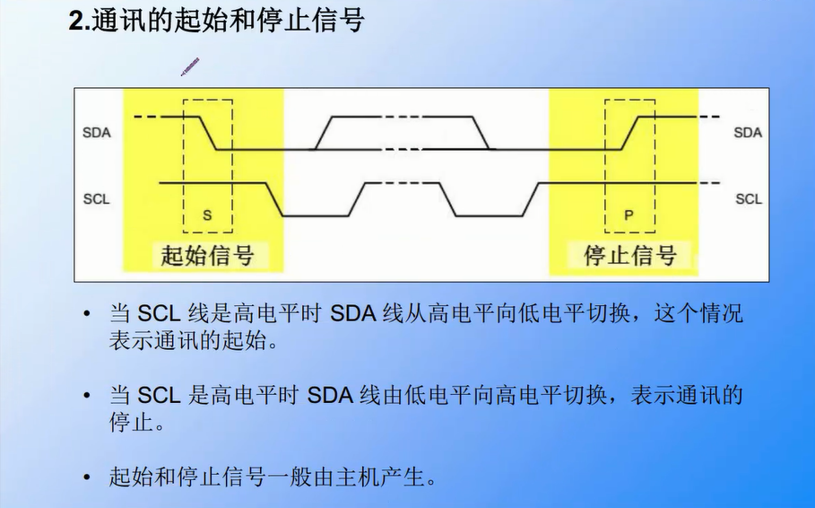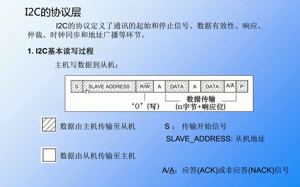 主机先广播从机的地址,在地址后面的这一位表示读写位,0表示写,当有这个地址的从机时,从机会回复一个应答位(ACK),然后主机向从机写数据,每发一个字节的数据,从机会回复一个应答位,当从机无法接收数据时,会回复给主机一个非应答信号,主机会发送一个停止位